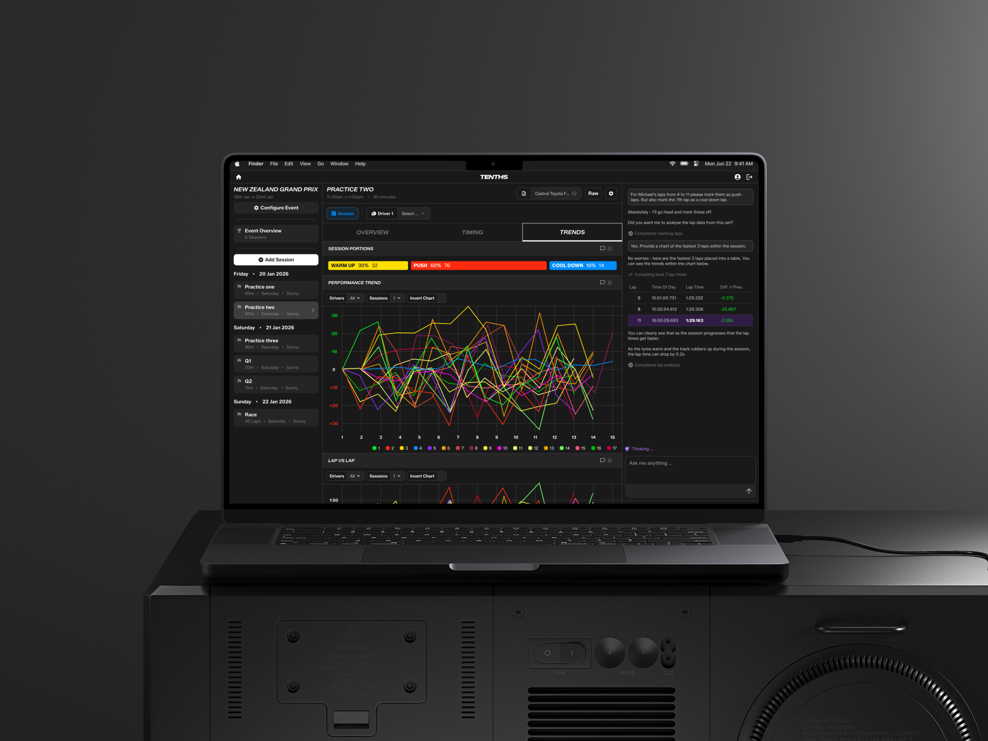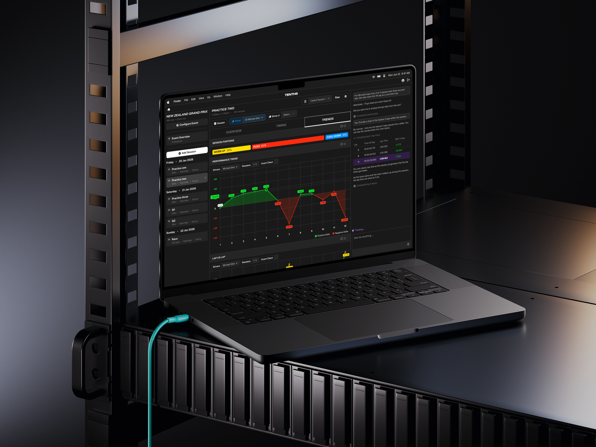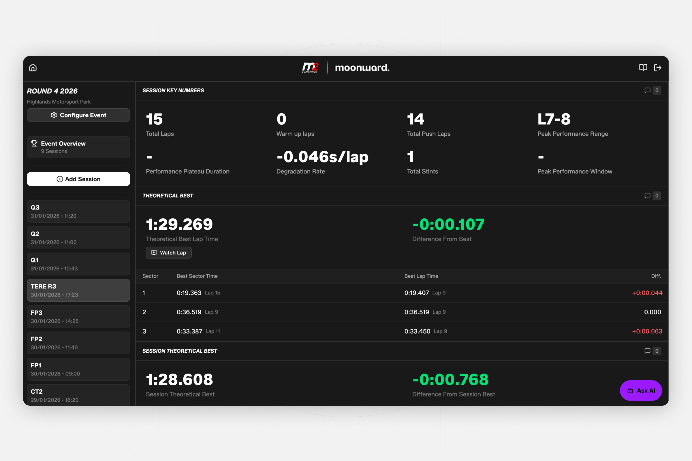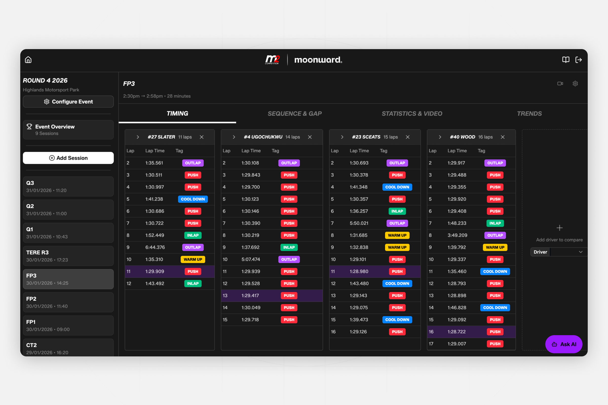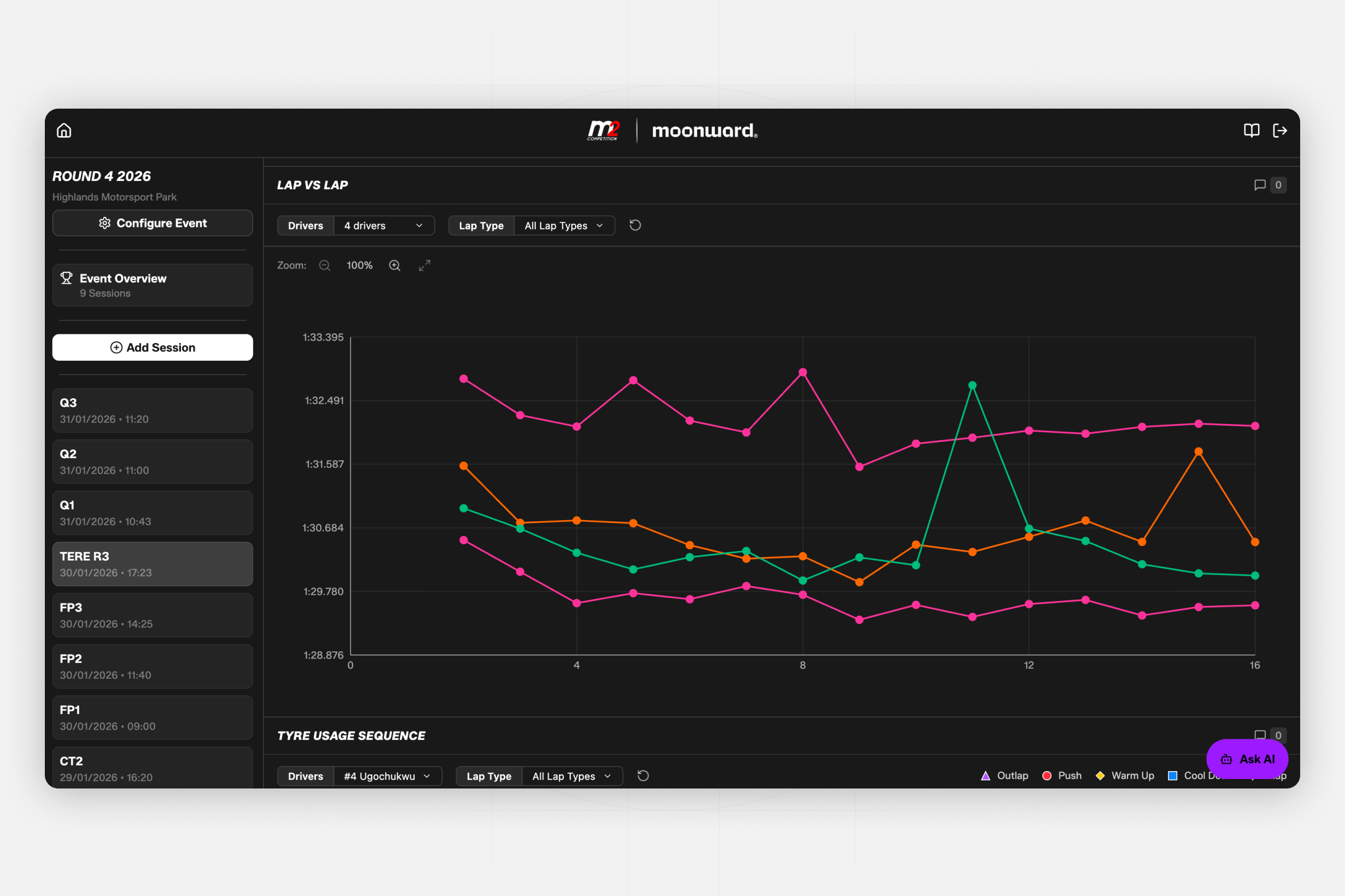 Moonward designed and built a fully integrated, end-to-end data analysis platform tailored specifically to M2 Competition's operational reality. The system was engineered to function without live telemetry, instead extracting maximum value from timing data and onboard footage, turning constraints into competitive leverage. At the core was a custom AI-driven PDF reader that ingested full-grid lap and sector data and structured it for deep analysis. From this foundation, the platform automatically surfaced insights including: Driver theoretical best laps, Session theoretical best laps, Gap-to-car-in-front analysis, Onboard footage auto clipping, Lap sequence breakdowns, Lap and sector time comparisons, Lap-versus-lap analysis, Tyre strategy trends across sessions, Lap time performance versus time of day, Relative driver and car rankings and Visual lap heat maps. All insights were delivered through a single, cohesive interface designed for rapid decision-making at the circuit.