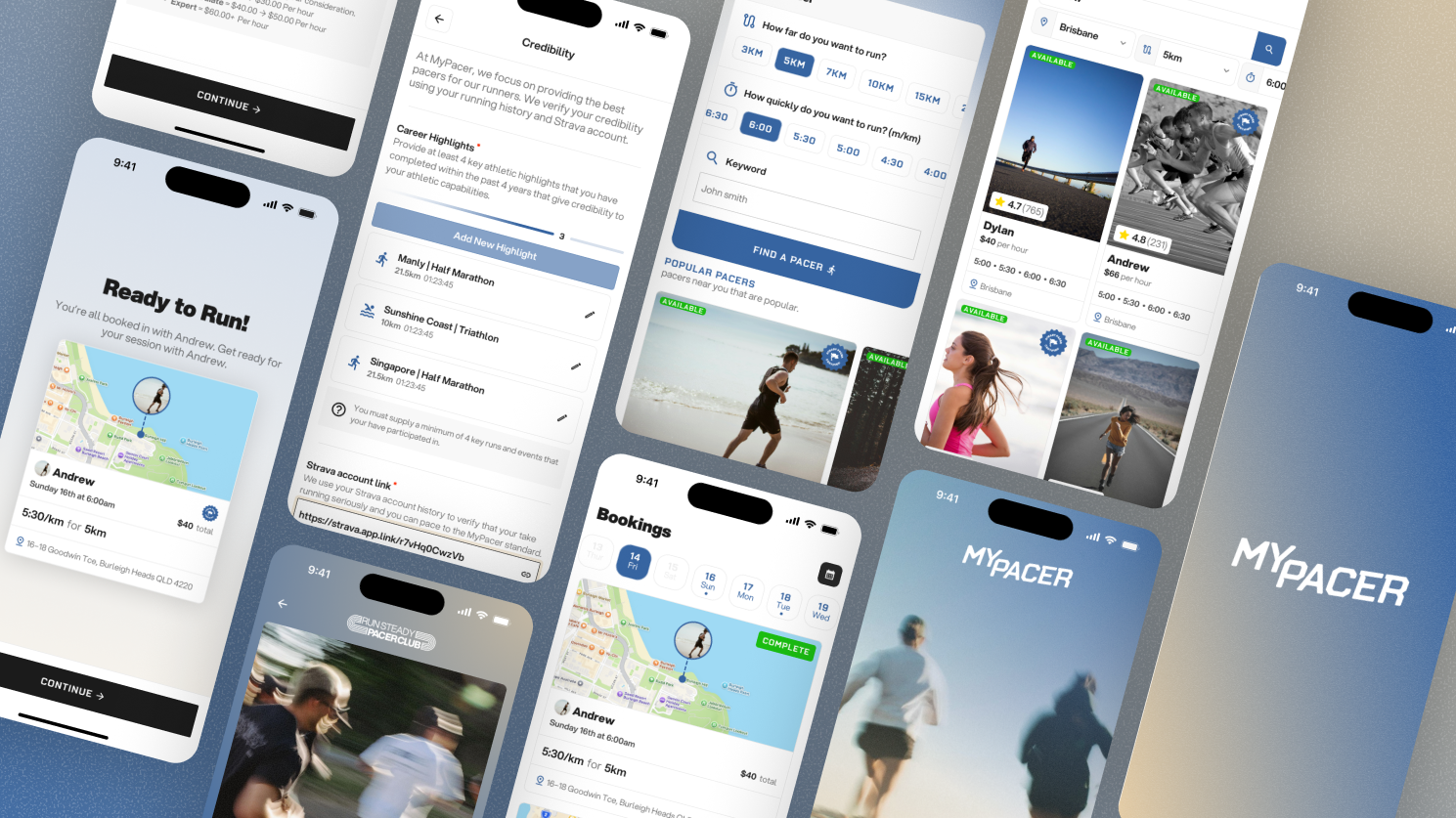 Moonward guided My Pacer through the full Devign process, from concept and UX design through to frontend and backend development. We built an intuitive interface that allows runners to find and book pacers, track their training progress, and stay motivated, while giving pacers the tools to manage bookings, communicate with runners, and receive payments seamlessly. The platform integrates scheduling, payments, and performance tracking into a cohesive, easy-to-use experience that meets the needs of both runners and pacers.