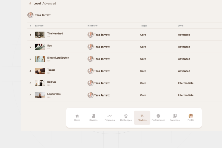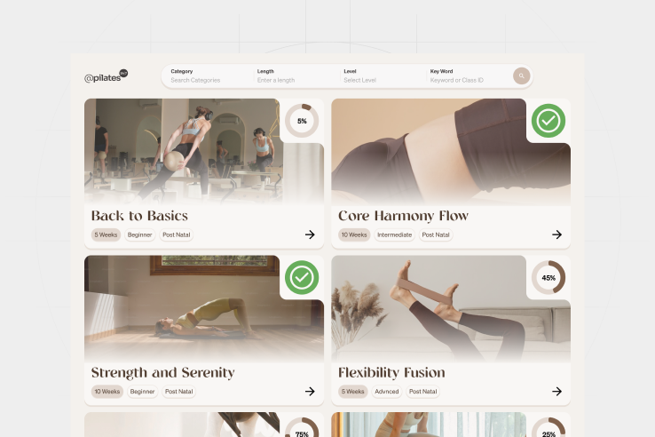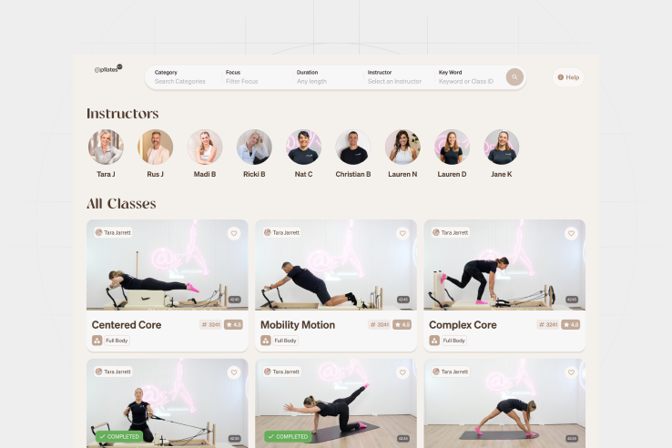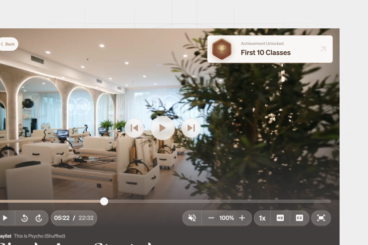 We implemented streaming infrastructure, a custom program builder, and studio admin tools while creating an intuitive mobile interface for members. Central to the platform are engaging features designed to motivate, track, and celebrate progress, including an extensive class library, goal-oriented programs, community-wide challenges, custom workout playlists, an achievement system, and global leaderboards. The platform was also designed to scale internationally while remaining easy to use for both members and studio staff.